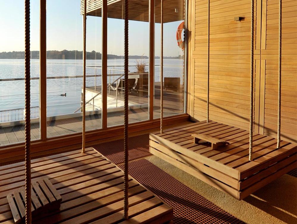 Ihre Architektur ist so einnehmend wie einzigartig: Die schwimmende Seesauna ist das absolute Highlight der Fontane Therme. Auf 70 Quadratemetern hinter großen Glasfassaden mit Blick auf den Ruppiner See schwitzen, bis 13 Uhr in der Biosauna mit 60 Grad, anschließend auf finnische Art bei 90 Grad. Wer mutig ist, kann direkt von dem schwimmenden Holzponton im See seine Abkühlung finden. Bei schönem Wetter lädt das große Sonnendeck zum Entspannen an der frischen Luft ein. Außerdem ist die Sauna mit großen Holzschaukeln ausgestattet, auf denen man bei rauerem Wetter leicht schaukelnd den Wellengang des Ruppiner Sees spüren kann. Regelmäßge Aufgüsse versprechen Abwechslung.